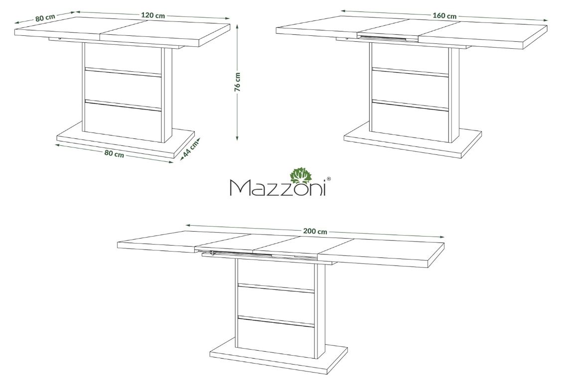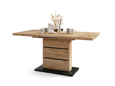 Ovaj sto je od hrasta i sa dva produžetka od 40 cm omogućavaju da se ploča stola produži sa 120 na 160 ili 200 cm – što je lako omogućeno zahvaljujući visokokvalitetnim sinhronim vođicama.